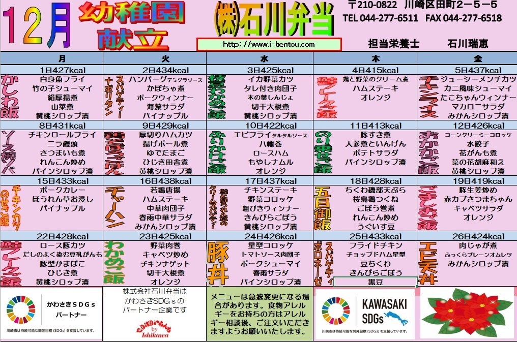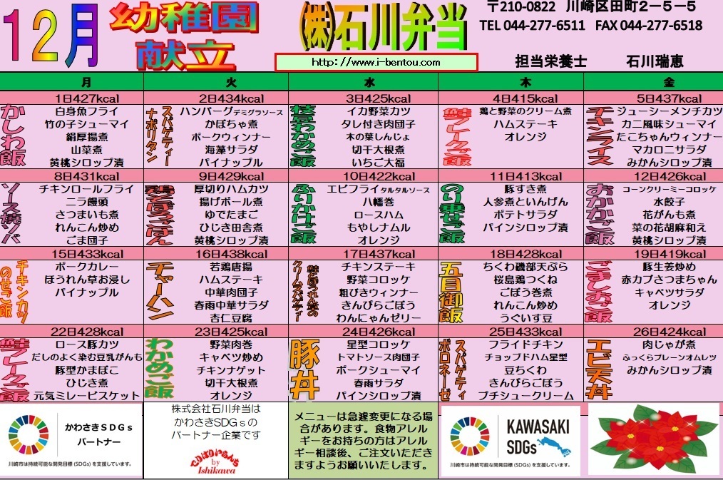 2025年 12月 幼稚園【きざみ食・お菓子なし】メニュー