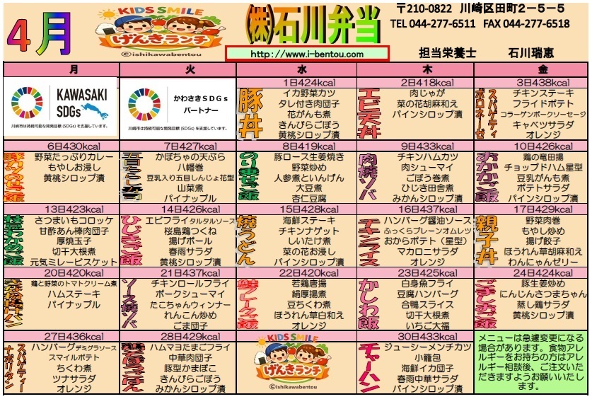 2026年 4月 幼稚園【げんきランチ普通食】メニュー